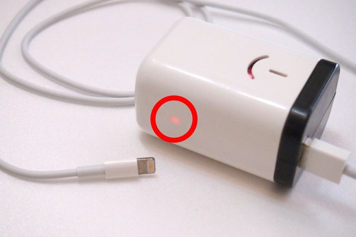 赤い丸で囲んだ部分が通電中に点灯するLED。写真のようにケーブルを挿しただけでも通電してしまうので、完全にオフにしたいときは本製品そのものからケーブルを取り外しましょう