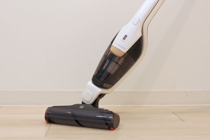 エレクトロラックスのエルゴラピードシリーズは、自立できるコードレススティック掃除機で、モーターなどの重心を下に置く設計が特徴です。これにより、手元にかかる負荷を抑えて体感重量を軽くして、動かしやすいように工夫しているんです。新しいエルゴラピード・パワープロも、この構造を踏襲。従来シリーズのメリットを引き継ぎながら、フローリング掃除がよりしやすいように最適化されたモデルとなります。