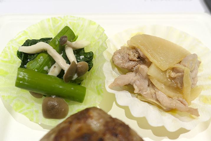 実際に新ヘルシオで作った料理を試食してみました。メインディッシュは「あぶり豊潤焼き」コースに新たに加わった「網焼きハンバーグ」メニュー(AX-XW600のみ)で作ったハンバーグです。副菜は「レンジで1品−5分おかず」コースで作った豚肉と大根の生姜風味、「低温蒸し青野菜」コースで作ったほうれん草としめじの塩麹和え、「まかせて調理」機能で作った夏野菜の焼きラタトゥイユ。もりだくさんです。