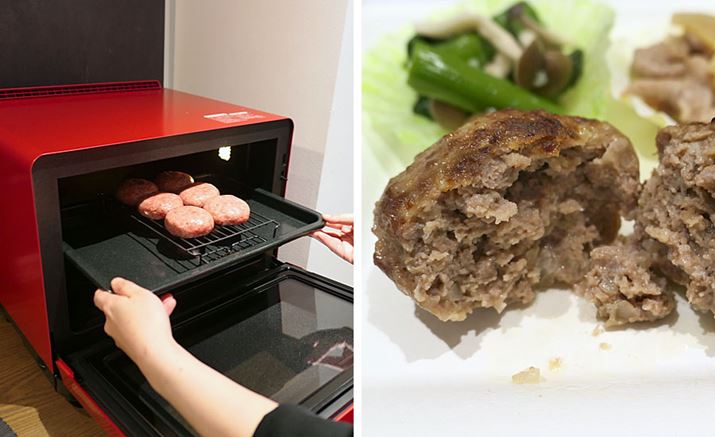 AX-XW600のみに搭載されている「あぶり豊潤焼き-網焼きハンバーグ」コースは、ハンバーグの表面を高温で焼き上げて焼き目をしっかりつけたあと、温度を下げて中までじっくり火を通します。実際に食べてみると、肉汁がじゅわーっとあふれ出てとても美味!