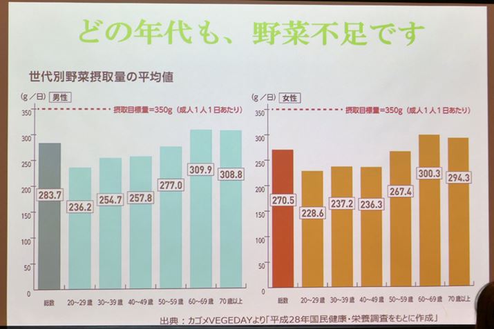 野菜はタンパク質や炭水化物をエネルギー変える役目があるため、それらを一緒に摂取する必要も。しかしどの年代の男女もみんな野菜不足です(画像はカゴメの発表資料から)