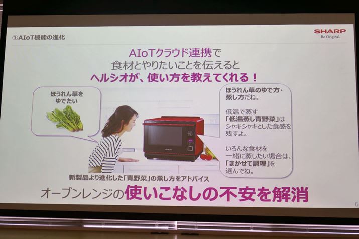 まず、シャープ独自の“AIoT”クラウド連携により、ヘルシオが食材の調理方法を教えてくれる機能が進化しました。以前からヘルシオはWi-Fi接続に対応しており、同社クラウドサービス「COCORO KITCHEN」と連携することで、ヘルシオに話しかけることによる音声操作が行えます。