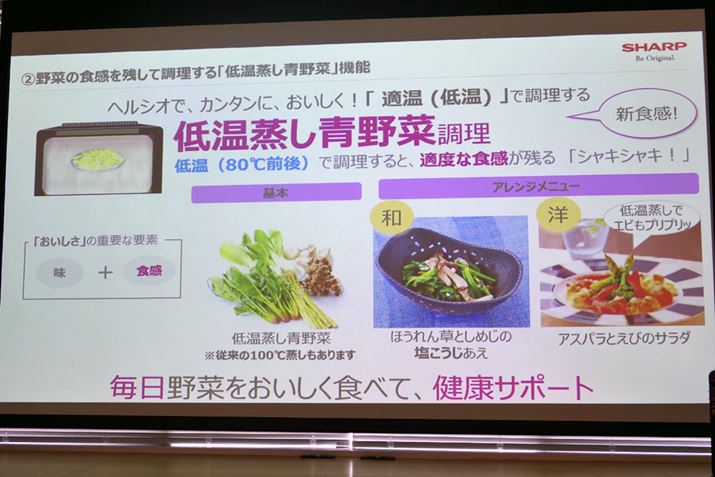 新しく搭載された「低温蒸し青野菜」コースや「レンジで1品」機能も組み合わせて考えると、新ヘルシオには野菜をたくさん摂れる調理メニューが満載。日本人の野菜不足解消にうってつけのオーブンレンジと言えるでしょう。