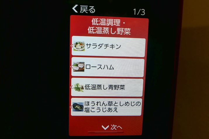 液晶画面をタッチすれば、「低温蒸し青野菜」メニューが選べます。適度に食感を残しながら青菜の蒸し野菜が作れるほか、エビなんかもプリプリに仕上がるそう