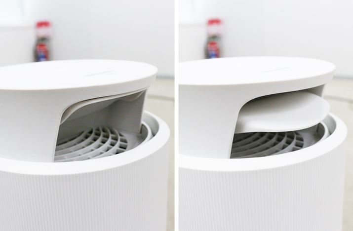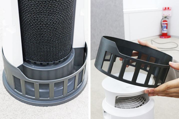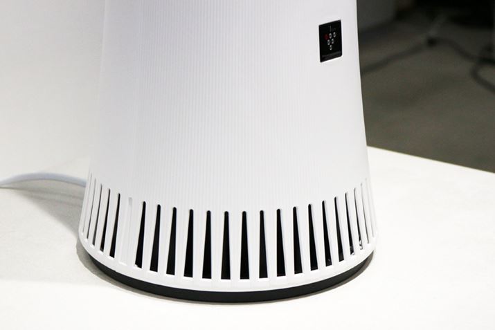 電源をオンにすると、本体下部360°に搭載された吸込口から室内の空気が吸い込まれます。ホコリなどを集じんする空気清浄機とは異なり、気流はそれほど重要ではないため、部屋のどの位置に設置してもいいとのこと