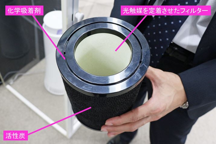 外側に脱臭フィルター、内側に光触媒を定着させたフィルターを組み合わせたのが、DY-S01に搭載される「光触媒脱臭フィルター」