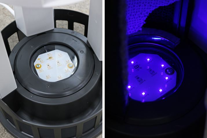 光触媒脱臭フィルターをセットした下には、LEDライトを搭載。運転が始まると青く点灯するので、脱臭フィルターに付着したニオイ成分は分解され続けます。運転を止めてしまうと光触媒作用も起こらないため、常時運転しておくほうがいいでしょう。消費電力は2.2〜11W