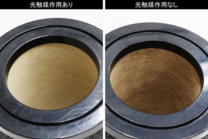 同じ構造のフィルターでも、光触媒作用の有無でこれほどタバコのヤニの付着具合が違ってくるのだそう。このような付着物により、フィルターが臭ったり、目詰まりを起こすため、光触媒作用のないフィルターは交換が必要になるといいます