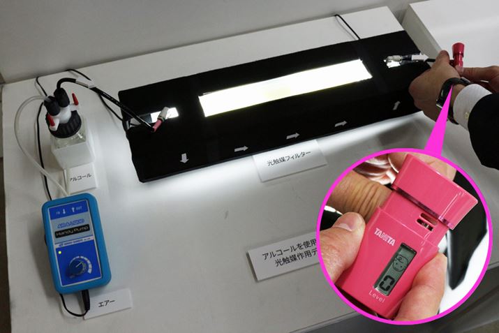 写真の装置は、アルコールのニオイを光触媒がどれほど分解できるかを実験するもの。光触媒の作用により、ブレスチェッカーの数値はニオイがしない「0」になりました