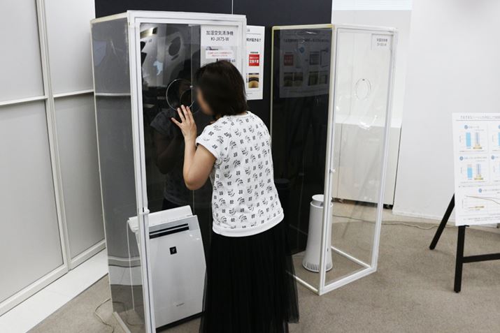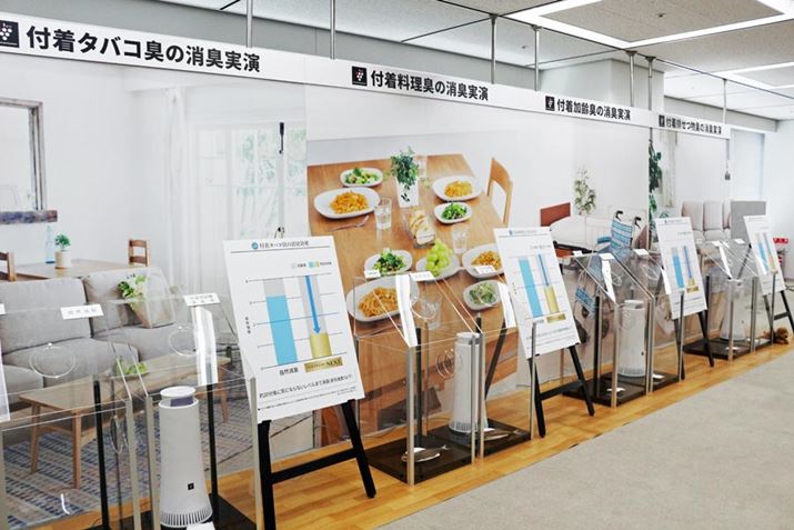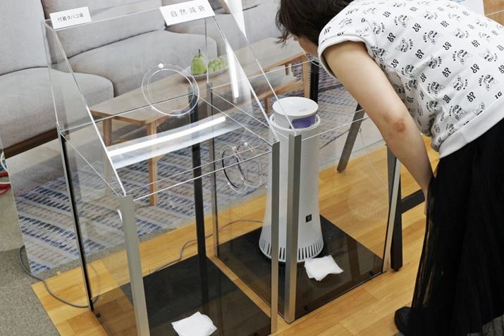 10年分相当のニオイを吸い込ませた、空気清浄機の最上位機「KI-JP100」(脱臭フィルターの交換の目安約10年)とDY-S01が用意されていたので、そのニオイをかいでみました。すると、光触媒のない空気清浄機のほうからは強烈なタバコ臭が! きちんとフィルター交換すれば問題ありませんが、交換せずに使い続けてしまう方はDY-S01を選んだほうがいいかもしれません