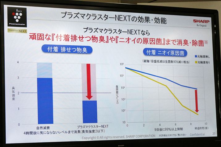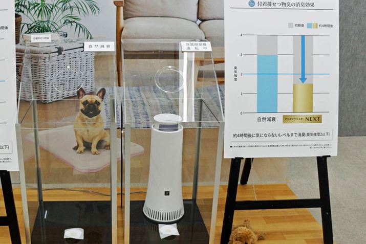 シャープが調査したプラズマクラスターNEXTの効果がこちら。付着ペット臭も強力に脱臭されるようです