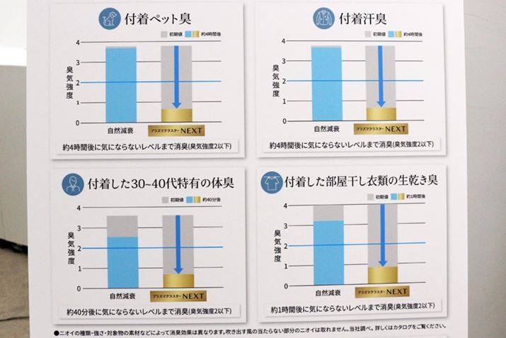 実際に、プラズマクラスターイオンの有無での消臭効果を確かめてみましたが、その差は歴然。特にタバコ臭の消臭効果は高いように感じました