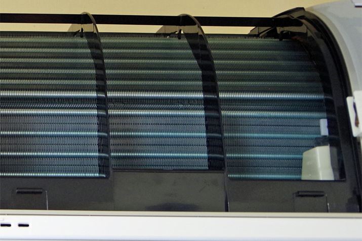 エアコン室内機内部の熱交換器は、細かく入り組んでいるため、非常に掃除がしづらい部分。ここにオフシーズンに細かいホコリやゴミなどが溜まると、そこに菌が取り付いて、カビなどを発生させやすい