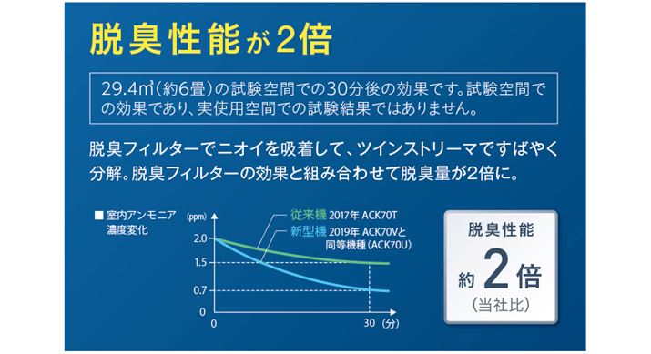 「ツインストリーマ」仕様となったダイキンのストリーマ空気清浄機「MCK70V」は、従来製品に比べて、脱臭性能も約2倍となった