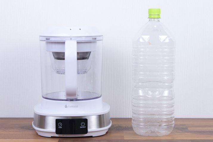 「CB-011W」の本体サイズは約210(幅)×240(奥行)×270(高さ)mm、重さは約1.2kg。2Lのペットボトルよりも背が低いので、使わない時も収納場所に困らない