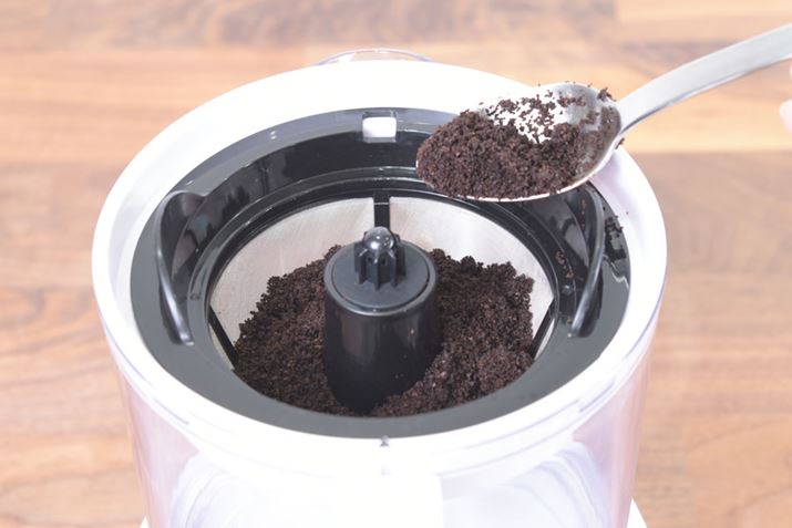 フィルターの役目を果たすコーヒーコンテナをポット上部に取り付けたら、湿らせたコーヒー粉を少し押さえつけるようなイメージでコーヒーコンテナに入れていく。なお、フィルターに入るコーヒー粉の最大量は45g
