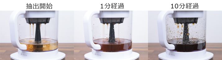 抽出時間とコーヒー粉の量を調節することで、ライトな味から濃く深みのある味まで、好みの濃さに調節できるのは「CB-011W」ならではのアピールポイントだ。試飲して「ちょっと薄いな」と感じたら、抽出の途中でも抽出完了後でも、好みの濃さになるまで追加抽出すればいい。コーヒー粉を水に浸すだけのポットタイプでは味の調節が難しいが、これなら狙い通りの濃度に仕上げられる。