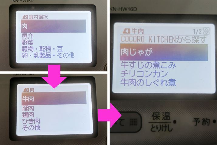 無線LAN搭載モデル(KN-HW24C とKN-HW16D)の液晶モニターの表示はこちら。レシピブックなしでも選べるので、断然、こっちのほうがイイ!