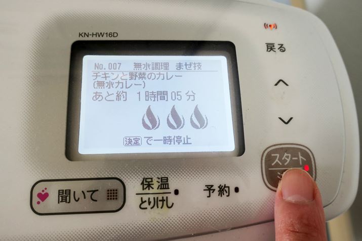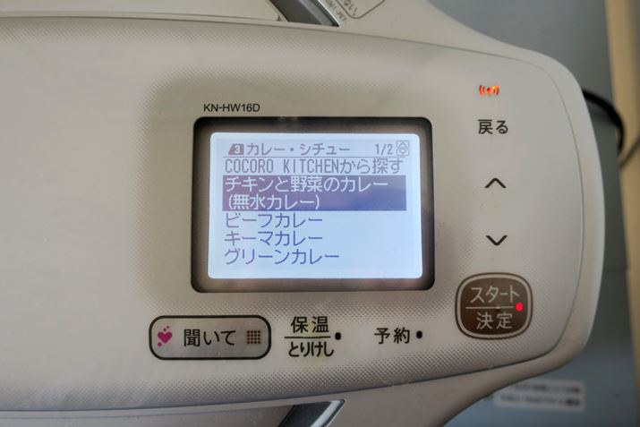 あとから知ったのですが、無線LANを搭載しないモデル(KN-HT24B とKN-HT99B)は、レシピブックを見て該当するメニュー番号を選択しなければならないのに対し、無線LAN搭載モデル(KN-HW24C とKN-HW16D)は、液晶モニターが文字表示となったそうです。作りたい料理や使いたい食材を液晶モニターで確認しながら、選んでいける無線LAN搭載モデルのほうが便利なのは間違いないでしょう。偶然とはいえ、KN-HW16Dを選んでよかった!