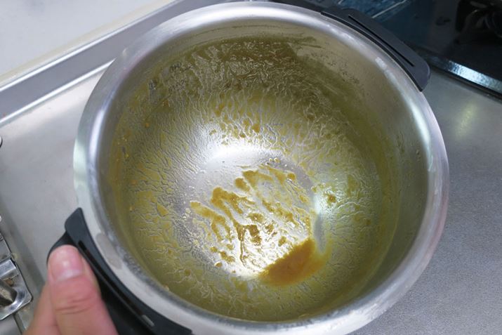 ちなみに、カレー作った鍋底には焦げ付きは一切なし。鍋内をかき混ぜてくれるまぜ技ユニットと、センサーで火加減を調整してくれる機能があるおかげかも
