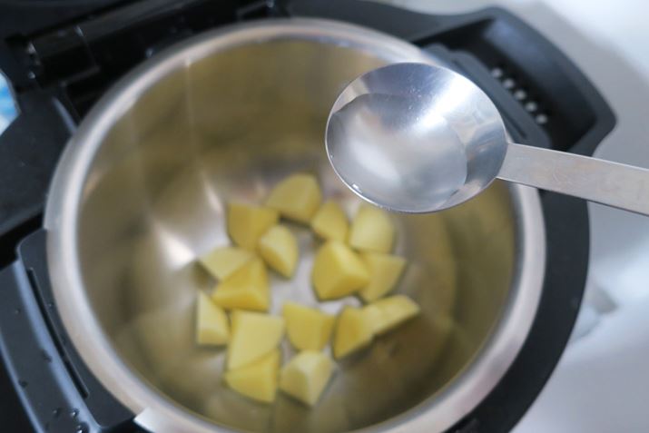 じゃがいもを8つにカットし、鍋に投入。芋やかぼちゃを茹でる際には、水を入れなければなりません。今回、入れる水の量は大さじ3杯です