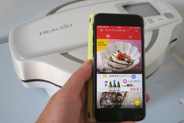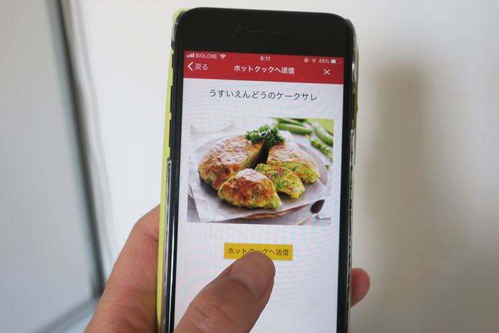 スマートフォンでCOCORO KITCHENにアクセスし、作りたいメニューを検索。「ホットクックへ送信」をタップすれば、ヘルシオ ホットクックにメニューが保存されます