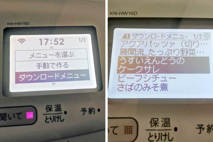そしてもうひとつ、手動調理が進化しました。これまでは煮物やスープといった調理方法を選んでから、かき混ぜ方や加熱時間を設定していましたが、KN-HW16Dは普通の鍋で調理をするように火加減や混ぜ方、加熱時間を設定できるように。設定したメニューは、スマートフォンのアプリで管理できるので、自分が見つけたベストな調理方法でいつでも作ることができます。