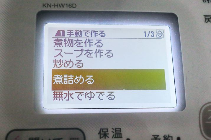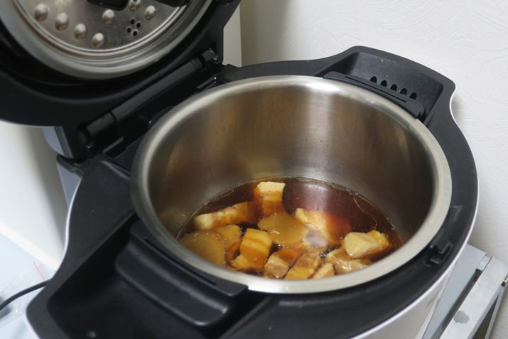 自動料理で作った豚の角煮は、まったく不満のない仕上がりでしたが、試しに、ちょっと煮詰めてみることにしました。なお、煮詰め機能は、フタを開けて使用します。汁が少ないものを煮詰める時は、菜箸などで混ぜながら煮詰めましょう