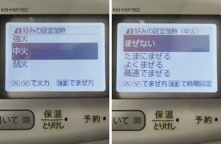 火加減は強火、中火、弱火から選べ、混ぜ方も4種類から選択でき、このあと加熱時間を設定。この設定内容は、アプリに自動管理されるので、メニュー名を編集して自分だけのオリジナルメニューとして登録しておくといいでしょう