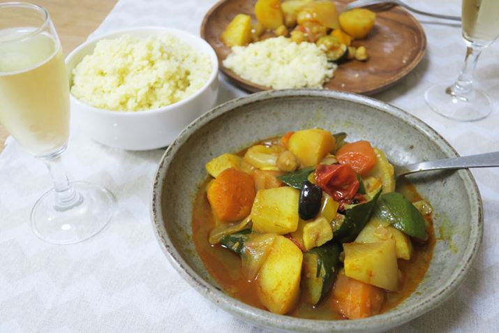 外食気分を盛り上げるため、クスクスとシードルも用意してみました。準備から盛り付けまで、トータル30分ほど。これで、この出来映えってステキすぎです。もちろん、料理もスパイシーでおいしい。ヘルシオデリ、クセになっちゃいそうです