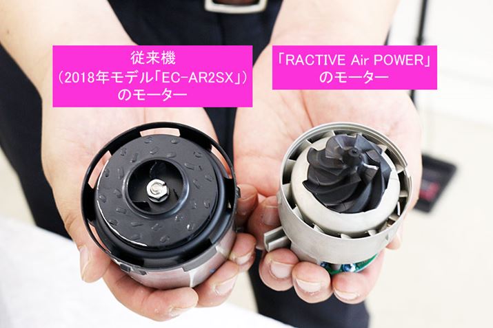 小型化したモーターで大風量を生み出せる大きなヒミツはファンにあります。平面な形状から立体形状とすることで、少ないパワーでも大きな風を作れるようなり、より効率がアップしたのだそう