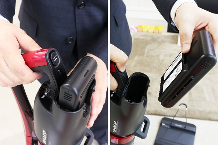 従来どおり、バッテリーは着脱式。バッテリーを2個用意しておけば、より長い時間掃除機がけできます。なお、プレミアムモデル「EC-SR3SX」はバッテリーが最初から2個付属。バッテリー単体で購入する場合、メーカー希望小売価格11,000円(税別)なので、あとからバッテリーを購入するなら、スタンダードモデルよりプレミアムモデルを選んだほうがお得かも