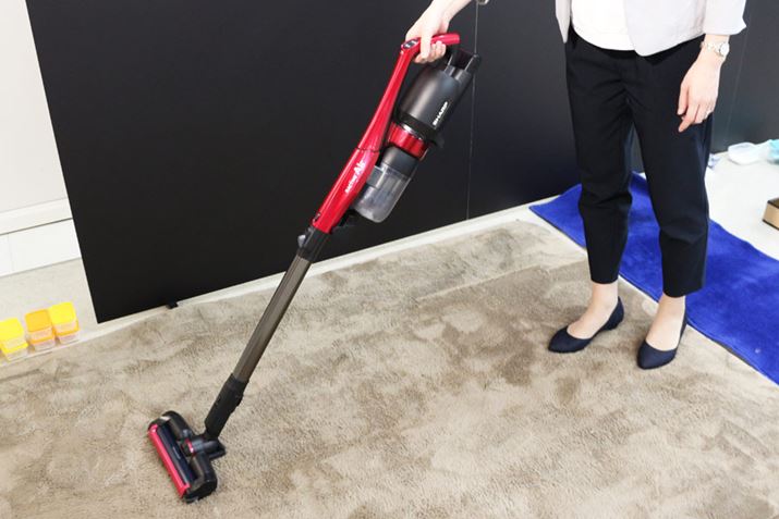 さらに、ヘッドが自走するアシスト機能も従来機より強めになりました。RACTIVE Air POWERの総重量は1.9kgになりましたが、自走アシストの強化やパイプの長さなどの細かい調整により、掃除機がけしている時の体感は軽く、腕への負担は従来どおり少ないのだそう。