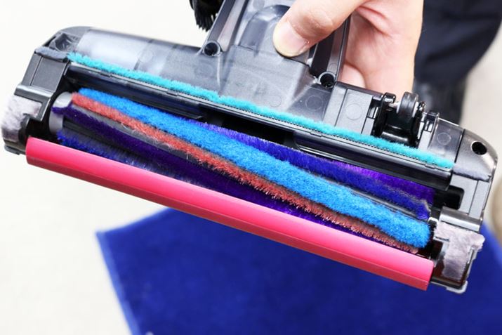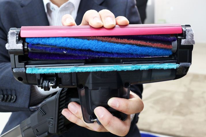 カーペットに付着した毛を吸い取った直後のブラシ。まったく毛がからみついていません。なお、からみついた毛をかき取り、吸込口に誘導するのは紫色の「かき取りブラシ」です
