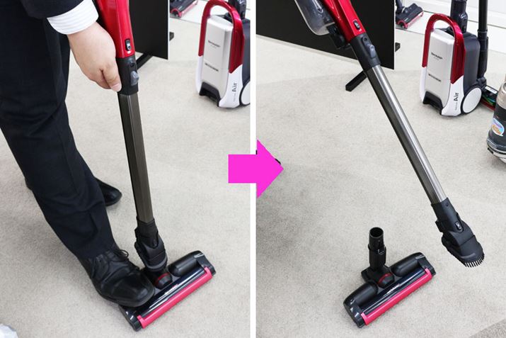 最後に、付属品と便利な機構を紹介しておきましょう。プレミアムモデル「EC-SR3SX」とスタンダードモデル「EC-SR3S」両方に付属するのは、「ベンリブラシ」「スグトルブラシ」「すき間ノズル」「クリーニングブラシ」「スタンド台」です。なかでも、パイプの先に装備されているベンリブラシは、その名のとおり便利! なぜなら、腰をかがめずヘッドを外せる機構となっており、瞬時にブラシの状態にできるからです。しかも、抜いたヘッドのパイプとの接続部が倒れず、自立したままなのもポイント。もとに戻す時も、立ったままスムーズに行えます。
