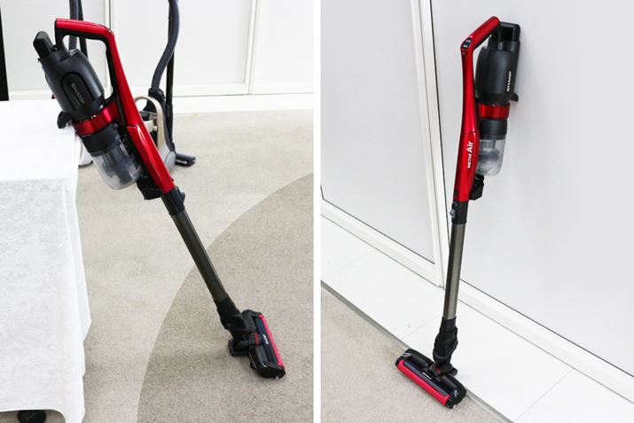 掃除機本体は自立しませんが、フックが装備されているので机などに引っかけることが可能。滑り止めの役割も果たすので、壁に立てかけても結構安定しています