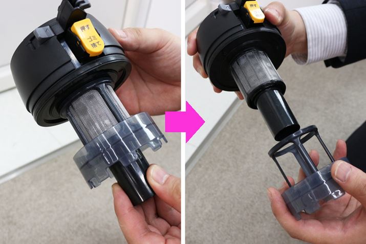お手入れにも、非常に魅力的な機構が採用されました。ダストカップを分解して水洗いできるのはもちろんですが、サイクロン部にからまった髪の毛を外しやすい工夫が施されているのです。どういった仕組みなのかは言葉では説明しにくいので、下の写真でご確認ください。