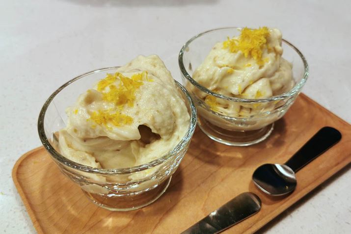 下ごしらえだけでなく、たとえば凍ったバナナとレモン果汁、ナッツを入れてかくはんするだけで、ヘルシーなジェラートが作れます。刻んだレモンの皮をのせるだけで、おしゃれなおもてなしデザートに!