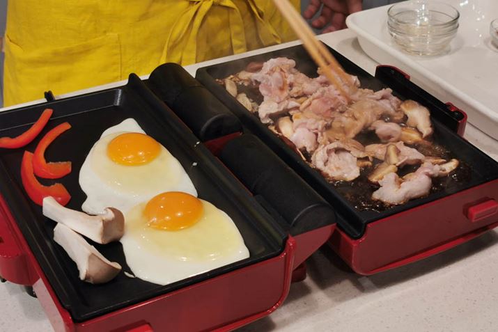 2面のプレートを生かして、片方のプレートで肉を炒めつつ、もう片方では目玉焼きを調理。目玉焼きの形が崩れる心配もありません