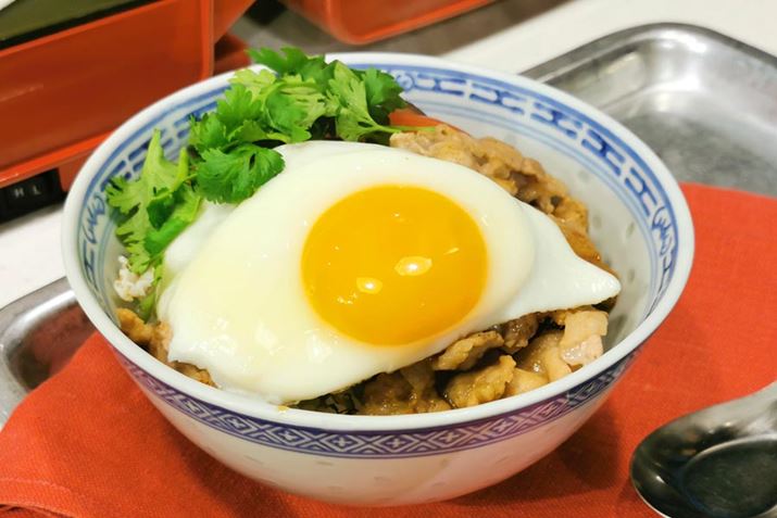 1台でルーロー飯ができあがり。プレートにはフッ素加工がほどこされているので、油を引かなくても目玉焼きがするっと取れます