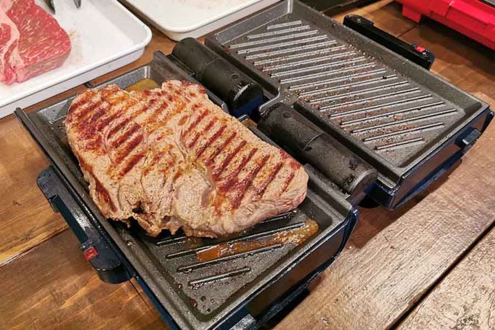 最高温度は250℃。凹凸プレート(付属)に付け替えて挟み焼きすれば、ステーキが短時間(レアなら6分ほど)でジューシーに焼き上がります
