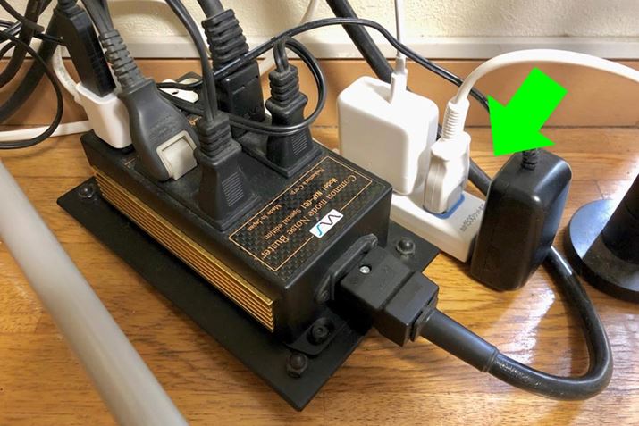 ↑こういうこと! タップ上のスペースに電源アダプター本体が収まりにくい場合、このように10cmコードを挟むことでアダプター本体をタップの外に逃がしてやることができます。