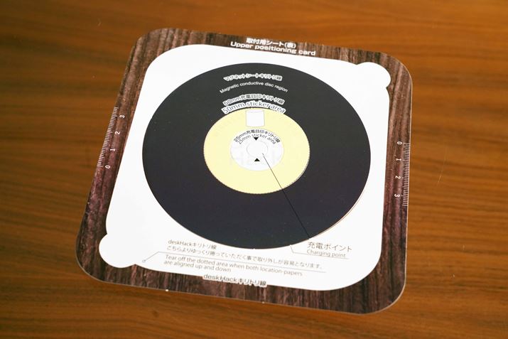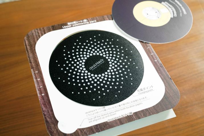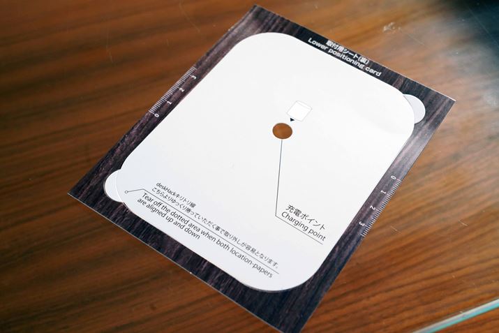 レビューは、実際に設置している様子がわかるように、ガラス製のテーブルで行いました。木製などのテーブルだと、どこに「deskHack」が設置されているかわからなくなりそうですが、同梱の取付用シートと目印シールを使うことで、どこが充電可能エリアかわかるようになっています。