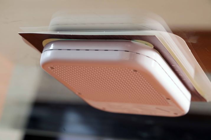 次は、取付用シート(裏)を、中心の充電ポイントに固定マグネットが入るようにテーブルの裏面に貼り付けます