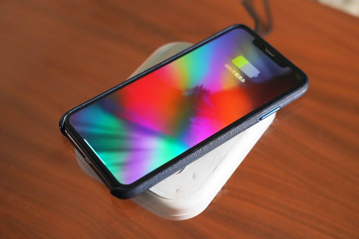「deskHack」を電源に接続して実際にiPhone XS Maxを置いてみると、きちんと充電が始まりました。ある程度予想はしていましたが、何もないテーブルの上でも充電できるのは、驚きです。