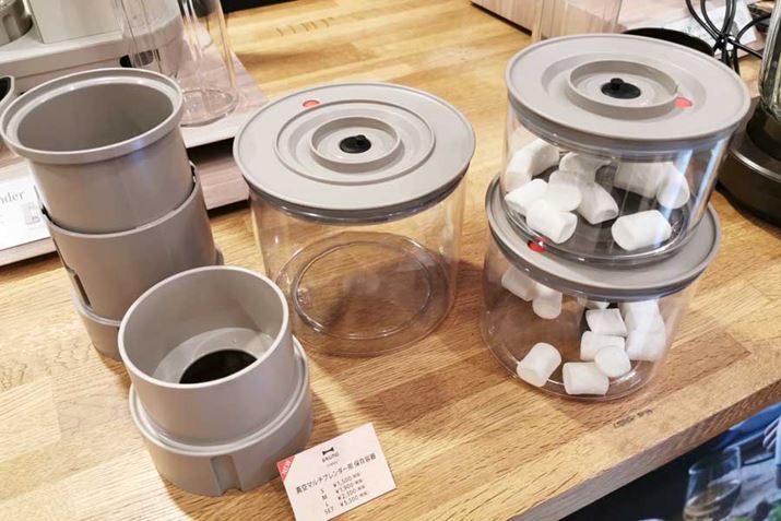 オプションの「真空ブレンダー用 保存容器セット」(税別5,500円)は、肉の下味調理やピクルスやマリネなどの漬け込みに使用できます。保存容器はS、M、Lの3サイズ展開で、それぞれ単品でも発売予定