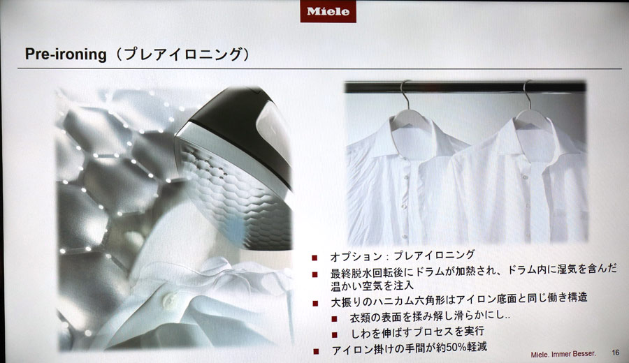 さらに、新機能として「プレアイロニング」が搭載されたことにも注目。最終脱水回転後にドラムが加熱され、湿気を含んだ空気をドラム内に注入、高速1,200回転でドラムを回して衣類同士のからみをほぐしながら、衣類のシワを伸ばすプロセスが加わるものです。これにより、アイロンがけの手間が約50%低減されるとか。