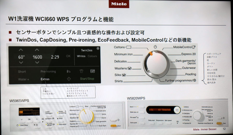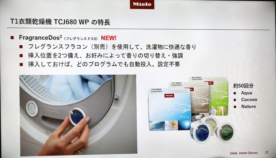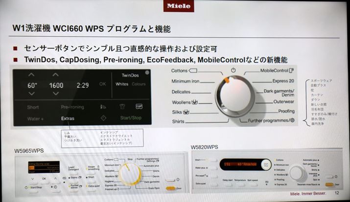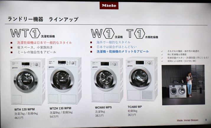 ミーレでは、「当社の製品は耐久性があり、乾燥機も20年は使い続けることができる。新たにヒートポンプを採用したことにより、週3回、20年間使い続けた場合、従来の製品よりトータルで20万円弱の電気代削減になる」とアピールします。