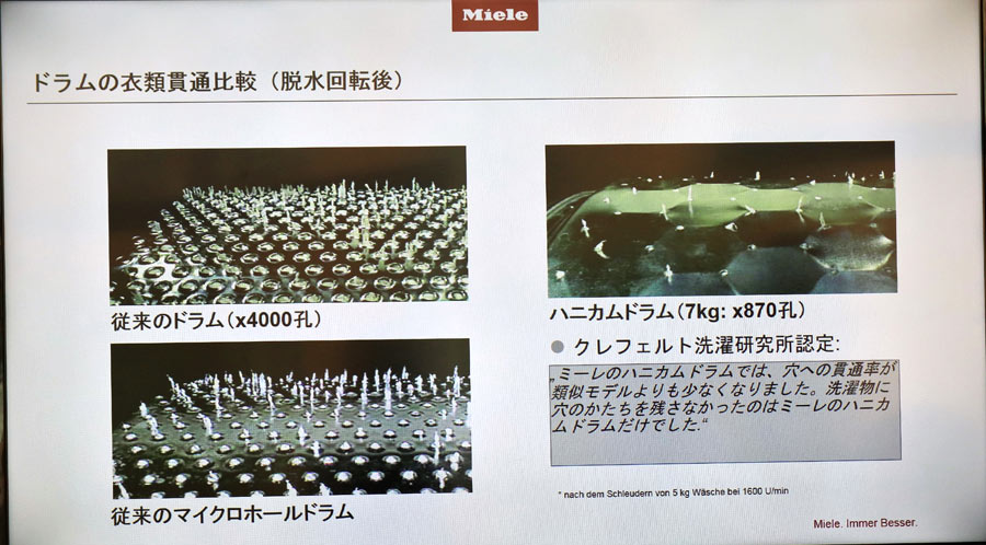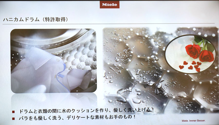 ミーレの洗濯槽はハニカム構造で衣類にやさしい洗い方ができる。バラも洗えるほどのやさしさだという