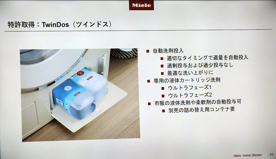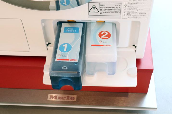 さらに、同社の洗濯乾燥機で好評の洗剤自動投入システム「TwinDos(ツインドス)」も搭載。専用の液体カートリッジ洗剤「ウルトラフェーズ」(1と2があります)を、適切なタイミングで適量自動投入するもので、人の手で量って投入するのに比べて洗剤を約30%節約できると言います。